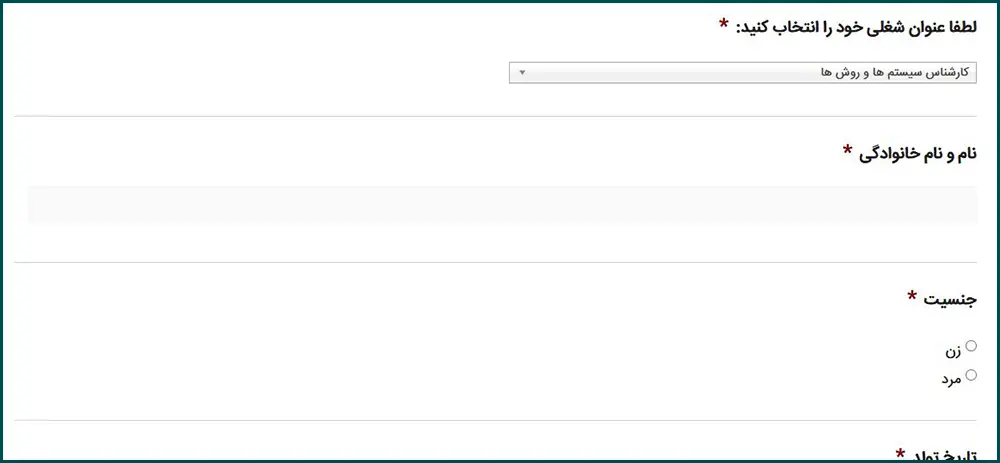 پس از ورود به صفحه فرم استخدام، اطلاعات درخواستی را مطابق موارد اعلامشده تکمیل نمایید.