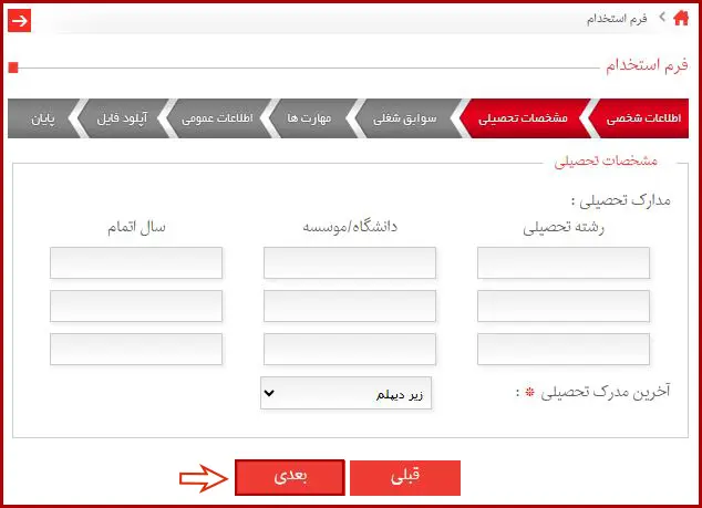 پس از وارد کردن اطلاعات تحصیلی، سوابق شغلی خود را تکمیل کرده و سپس بر روی گزینه «بعدی» کلیک نمایید.