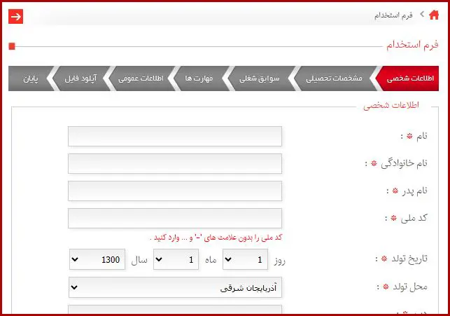 پس از ورود به صفحه فرم استخدام، اطلاعات شخصی خود نظیر نام و نام خانوادگی، نام پدر، کدملی، تاریخ تولد و... را وارد کرده و سپس بر روی گزینه «بعدی» کلیک نمایید.