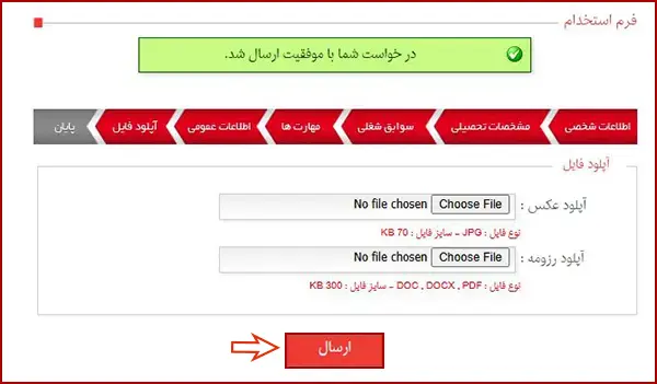 پس از تکمیل اطلاعات عمومی، عکس و رزومه خود را آپلود کرده و سپس بر روی گزینه «ارسال» کلیک نمایید.