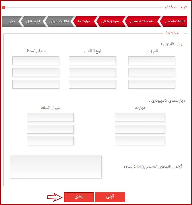 پس از وارد کردن سوابق شغلی، مهارتهای خود را (مانند آشنایی به زبانهای خارجی) وارد کرده و سپس بر روی گزینه «بعدی» کلیک نمایید.