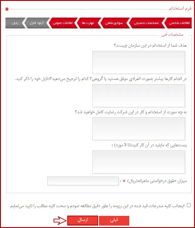 پس از وارد کردن مهارتها، اطلاعات عمومی خود را طبق موارد خواسته شده پاسخ دهید و سپس بر روی گزینه «ارسال» کلیک نمایید.