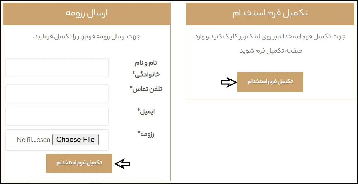 نکته: اگر دارای فایل رزومه هستید، میتوانید از سمت چپ صفحه بخش ارسال رزومه، رزومه خود را آپلود کرده سپس بر روی گزینه «تکمیل فرم استخدام» کلیک نمایید. همچنین اگر فایل رزومه ندارید، میتوانید طبق مراحل زیر فرم استخدام را تکمیل نمایید.