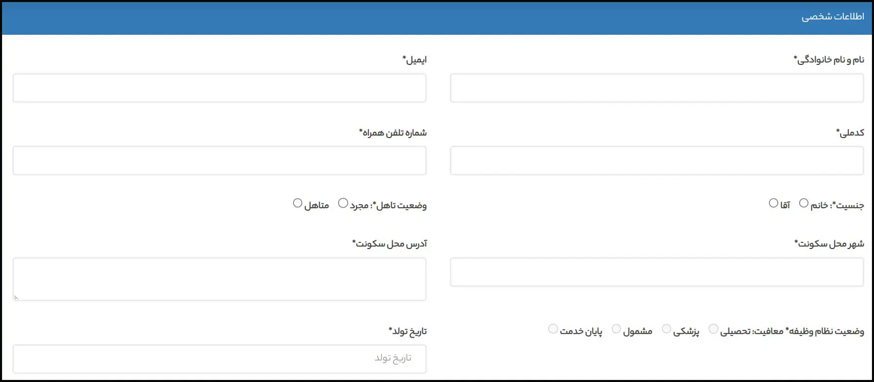 توجه: این فرم استخدام بر اساس نسخه دسکتاپ طراحی و تنظیم شده است؛ بنابراین ممکن است در تلفن همراه با تغییراتی در نمایش یا چیدمان مواجه شوید. بهمنظور سهولت در تکمیل فرم، توصیه میشود از رایانه استفاده نمایید.