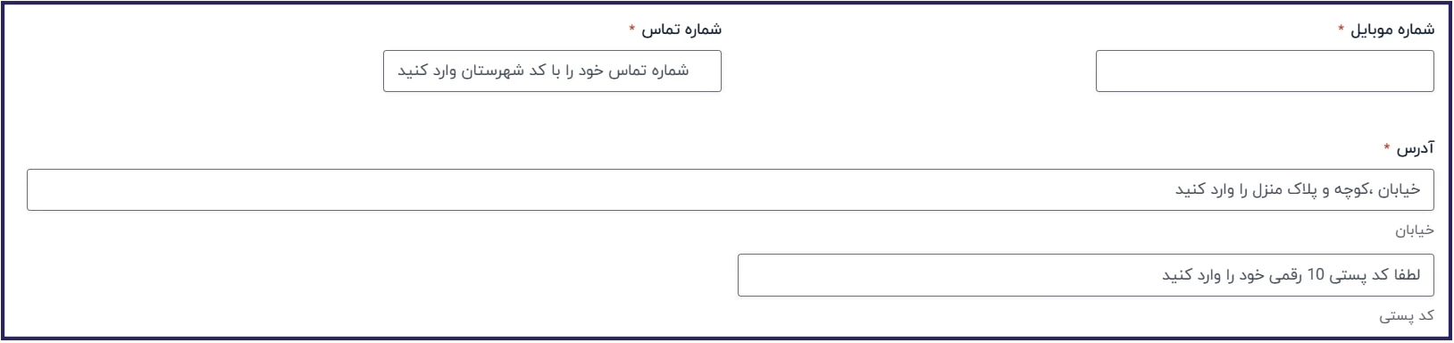 در این مرحله باید اطلاعات تماس خود، شامل شماره موبایل، شماره تلفن ثابت، آدرس و.. را وارد نمایید.