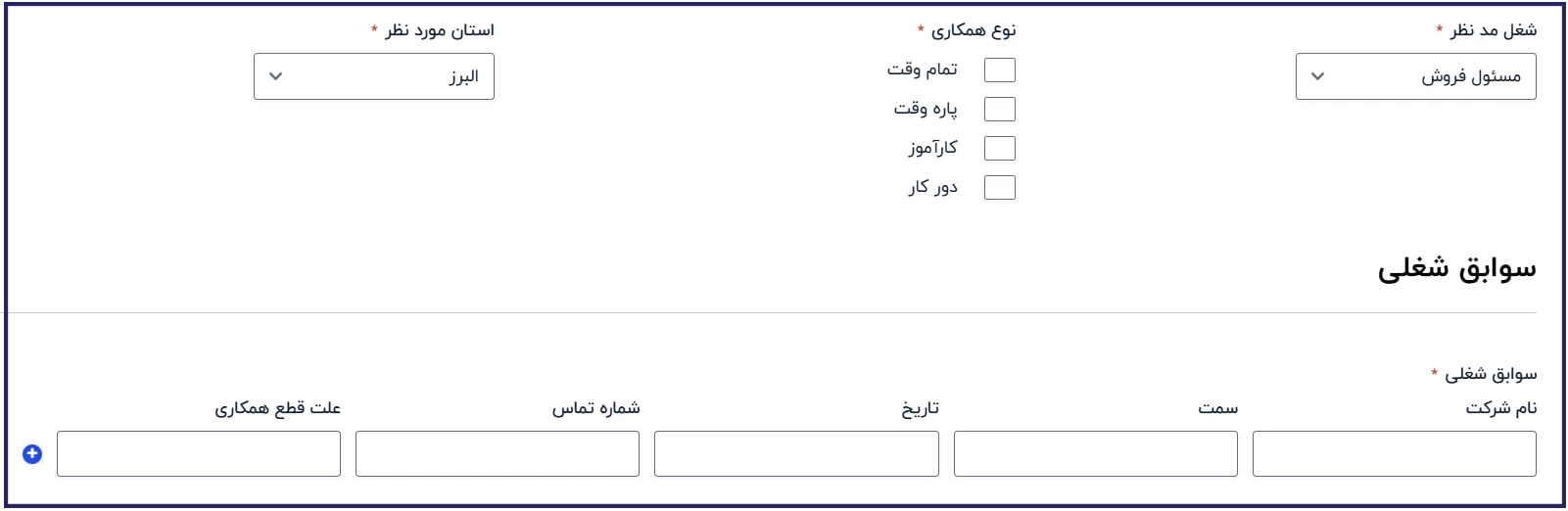 در این مرحله از فرم استخدام، لازم است شغل موردنظر، نوع همکاری و استان محل خدمت را مشخص کنید. سپس در بخش سوابق شغلی، باید اطلاعات مربوط به تجربیات کاری پیشین خود، شامل نام شرکت، سمت شغلی، تاریخ اشتغال و.. را وارد نمایید.