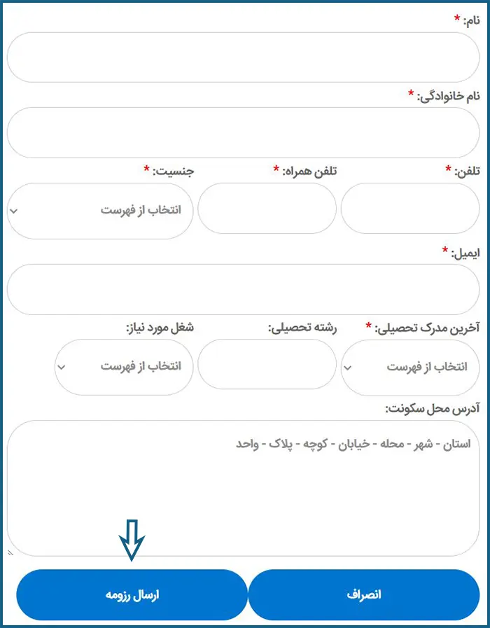 پس از مشاهده فرصتهای شغلی، فرم استخدام را تکمیل نمایید. در این فرم، اطلاعات هویتی و تماس شما شامل نام و نام خانوادگی، شماره تماس، ایمیل، جنسیت، سوابق تحصیلی، شغل موردنظر و آدرس محل سکونت باید وارد شود. پس از تکمیل فرم، بر روی دکمه «ارسال رزومه» کلیک کنید.
