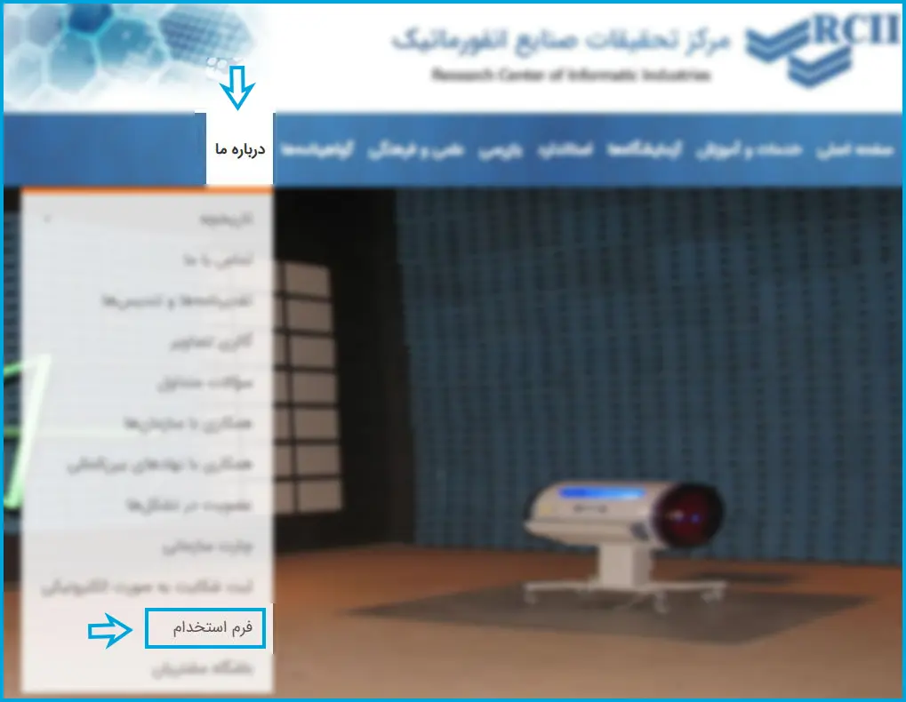 پس از ورود به صفحه اصلی مرکز تحقیقات صنایع انفورماتیک، از سربرگ بالای سایت گزینه «درباره ما» را انتخاب کرده و سپس بر روی گزینه «فرم استخدام» کلیک نمایید.