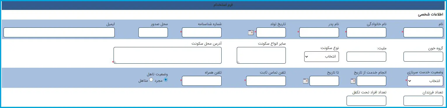 با کلیک بر روی «فرم استخدام»، وارد صفحه تکمیل فرم میشوید. در این بخش لازم است اطلاعات شخصی شامل نام و نام خانوادگی، نام پدر، تاریخ تولد، شماره شناسنامه، وضعیت نظام وظیفه، شماره تماس و سایر اطلاعات خواستهشده را بهطور کامل و دقیق وارد نمایید.