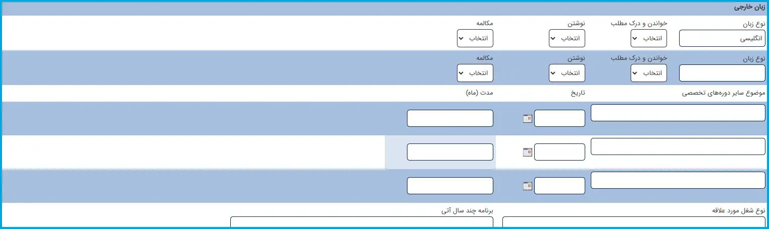 در صورت آشنایی با زبانهای خارجی، اطلاعات مربوط به نوع زبان و سطح مهارت خود را طبق موارد خواستهشده ثبت نمایید.