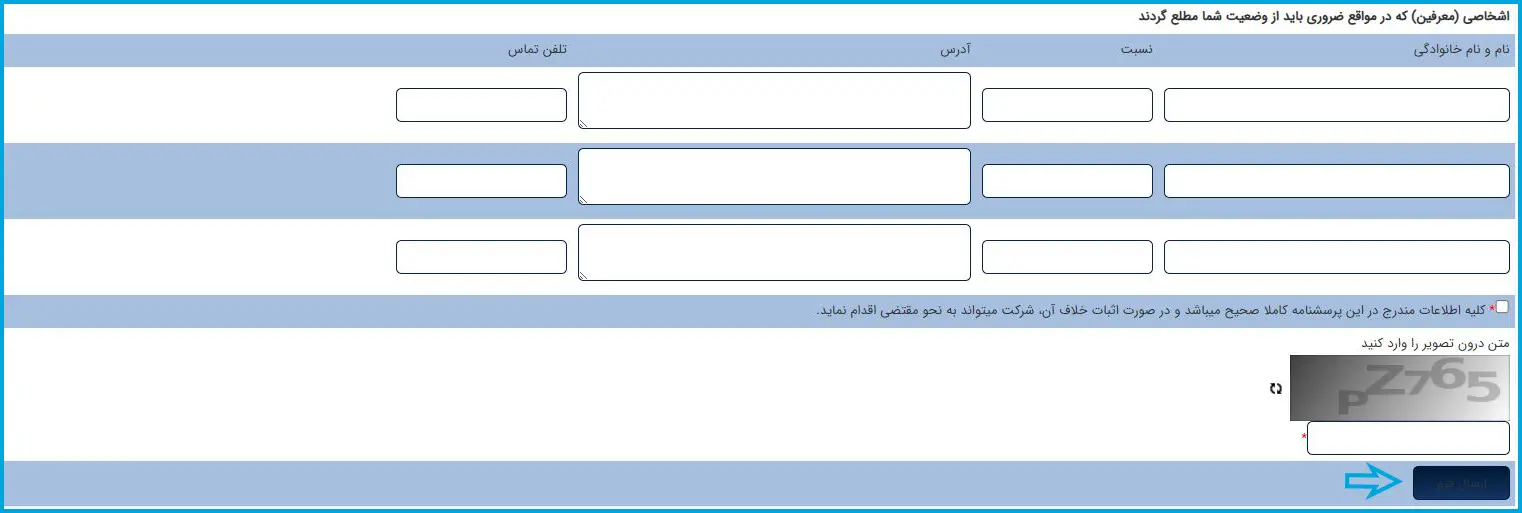در صورت داشتن معرف، اطلاعات معرف یا معرفین را تکمیل کنید. سپس توضیح درجشده در انتهای فرم را مطالعه کرده و تیک مربوطه را فعال نمایید. در ادامه، کد امنیتی را مطابق تصویر وارد کرده و بر روی دکمه «ارسال فرم» کلیک کنید.