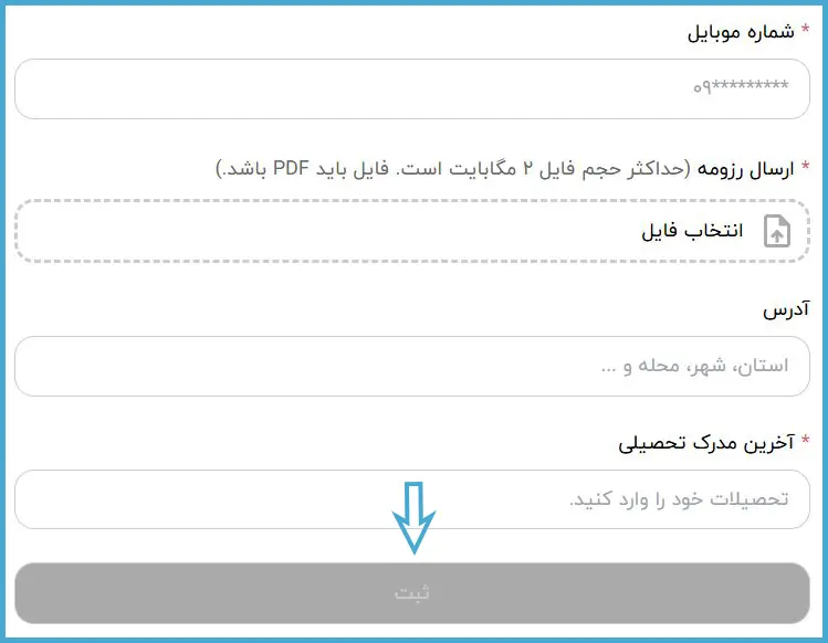 در این مرحله، ابتدا شماره تماس خود را وارد کرده و سپس فایل رزومه را بارگذاری نمایید. در ادامه، آدرس محل سکونت و آخرین مدرک تحصیلی خود را ثبت کنید. در پایان، با کلیک بر روی دکمه «ثبت»، درخواست شما نهایی خواهد شد.