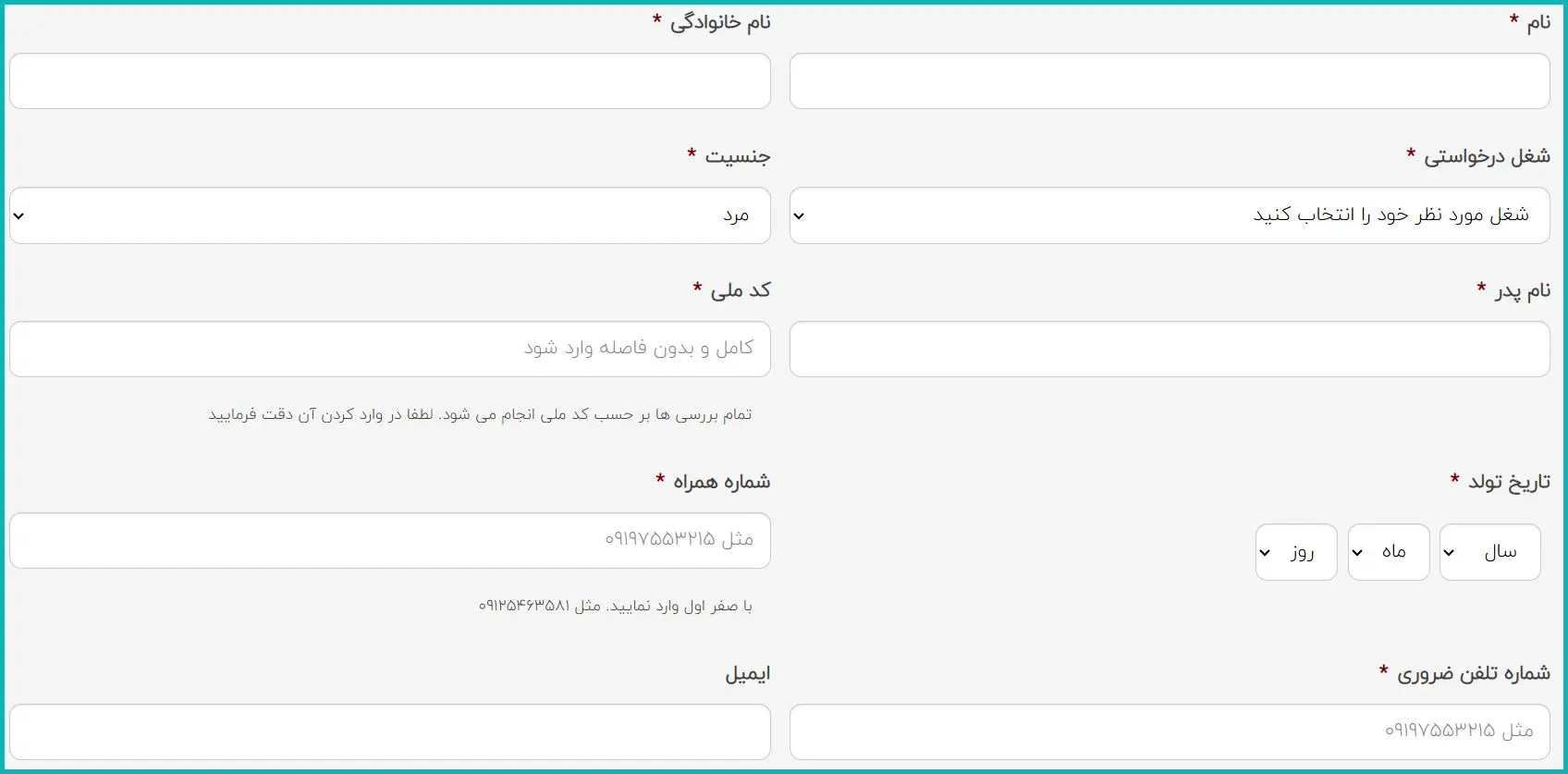 توجه: این فرم استخدام بر اساس نسخه دسکتاپ طراحی و تنظیم شده است؛ بنابراین ممکن است در تلفن همراه با تغییراتی در نمایش یا چیدمان مواجه شوید. بهمنظور سهولت در تکمیل فرم، توصیه میشود از رایانه استفاده نمایید.