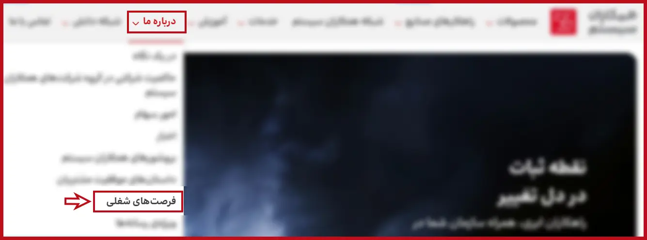 پس از ورود به صفحه اصلی شرکت همکاران سیستم، از منوی بالای سایت گزینه «درباره ما» را انتخاب نمایید. سپس بر روی گزینه «فرصتهای شغلی» کلیک کنید تا وارد صفحه مربوطه شوید.