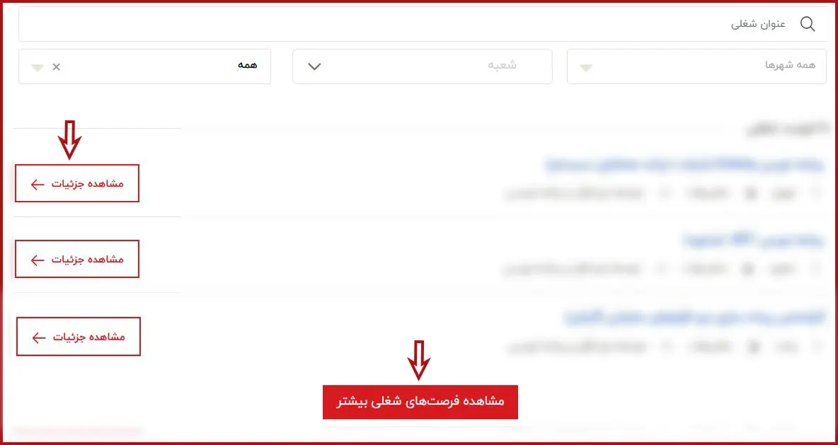 با انتخاب گزینه مشاهده فرصتهای شغلی، فهرست مشاغل فعال نمایش داده میشود. در صورت تمایل به مشاهده تمامی آگهیها، میتوانید بر روی دکمه «مشاهده فرصتهای شغلی بیشتر» کلیک کنید. پس از بررسی عناوین، موقعیت شغلی موردنظر خود را انتخاب کرده و برای اطلاع از توضیحات و شرایط استخدام، بر روی گزینه «مشاهده جزئیات» کلیک نمایید. همچنین برای دسترسی آسانتر و سریعتر به موقعیت شغلی موردنظر، میتوانید از ابزارها و فیلترهای موجود در بالای صفحه آگهیها استفاده نمایید تا نتایج متناسب با نیاز شما نمایش داده شود.