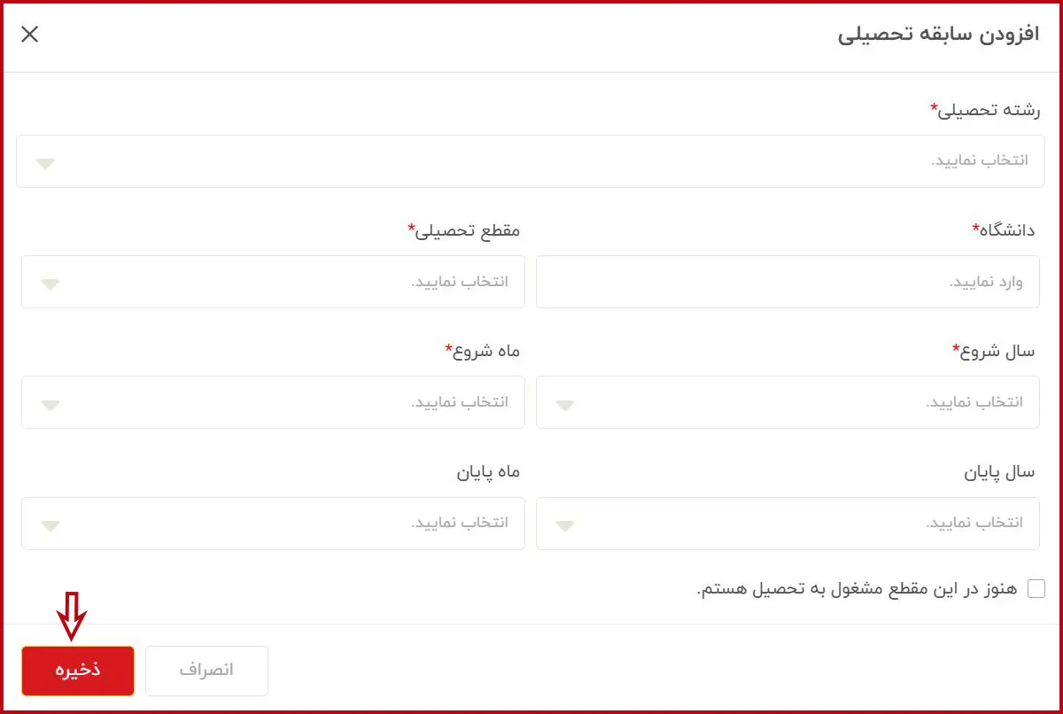 پس از تکمیل اطلاعات سابقه شغلی، لازم است اطلاعات سابقه تحصیلی خود شامل رشته تحصیلی، دانشگاه، مقطع تحصیلی و… را وارد کرده و سپس بر روی گزینه «ذخیره» کلیک نمایید.