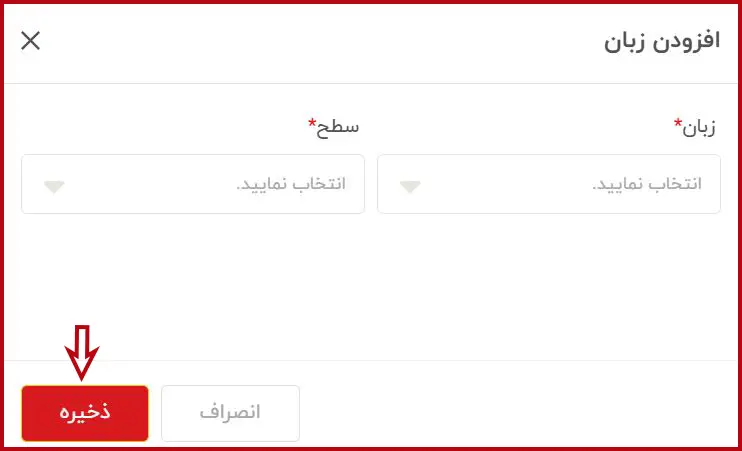 در این مرحله، زبان و سطح آشنایی خود را وارد کرده و سپس بر روی گزینه «ذخیره» کلیک کنید.