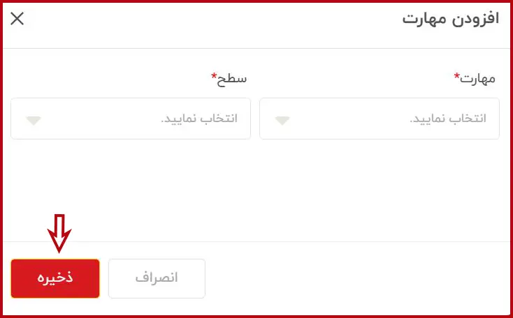 در این مرحله، مهارتها و سطح عملکرد خود در هر مهارت را وارد نمایید. سپس بر روی گزینه «ذخیره» کلیک نمایید.