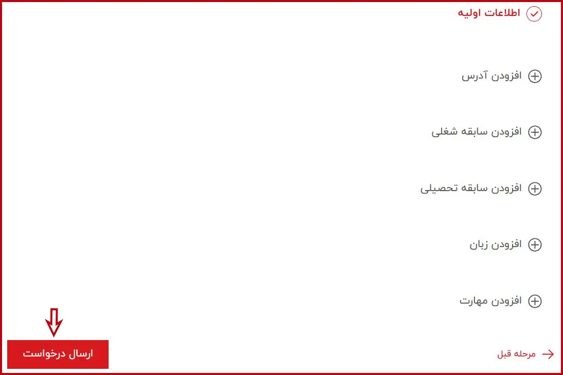 پس از تکمیل و بررسی نهایی تمامی اطلاعات واردشده، بر روی گزینه «ارسال درخواست» کلیک نمایید تا فرم استخدام شما در سامانه ثبت گردد.