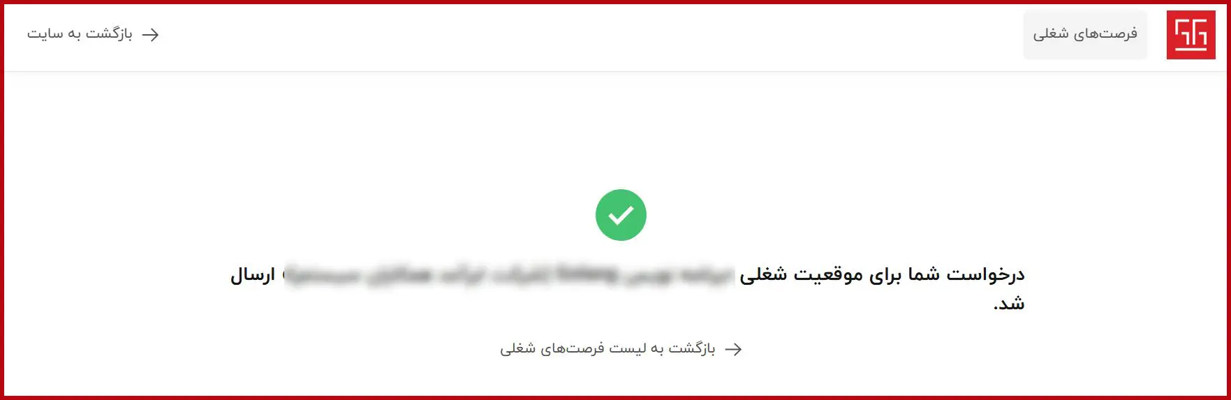 پس از ارسال فرم استخدام، پیام تأیید مطابق تصویر زیر نمایش داده میشود. مشاهده این پیام به معنای ثبت موفق درخواست شما و قرار گرفتن آن در صف بررسی کارشناسان همکاران سیستم است. در صورت تطابق اطلاعات ارسالشده با شرایط شغل موردنظر، کارشناسان مربوطه با شما تماس خواهند گرفت.