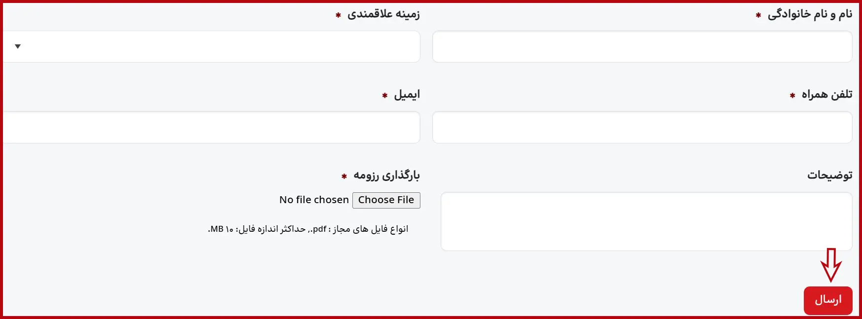 در این مرحله لازم است اطلاعات هویتی خود شامل نام و نام خانوادگی، زمینه علاقهمندی، تلفن همراه، ایمیل و… را وارد نمایید. سپس فایل رزومه خود را بارگذاری کرده و در نهایت بر روی گزینه «ارسال» کلیک کنید.