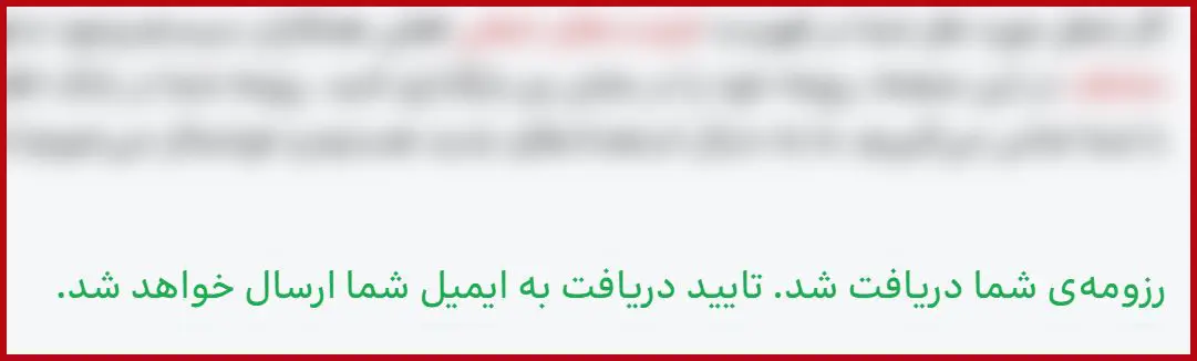 پس از ارسال فرم استخدام، پیام تأیید مطابق تصویر نمایش داده میشود. مشاهده این پیام به معنای ثبت موفق درخواست شما و قرار گرفتن آن در صف بررسی کارشناسان همکاران سیستم است. در صورت تطابق اطلاعات ارسالشده با شرایط شغل موردنظر، نتیجه رزومه به ایمیل شما ارسال میشود.