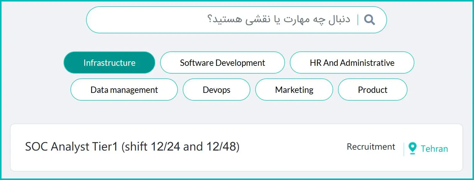 در این مرحله، لیست فرصتهای شغلی فعال قابل مشاهده است. میتوانید از طریق انتخاب حوزه شغلی موردنظر یا با استفاده از بخش جستجو، عنوان شغل دلخواه خود را پیدا کنید. پس از یافتن موقعیت مناسب، بر روی آن کلیک نمایید.
