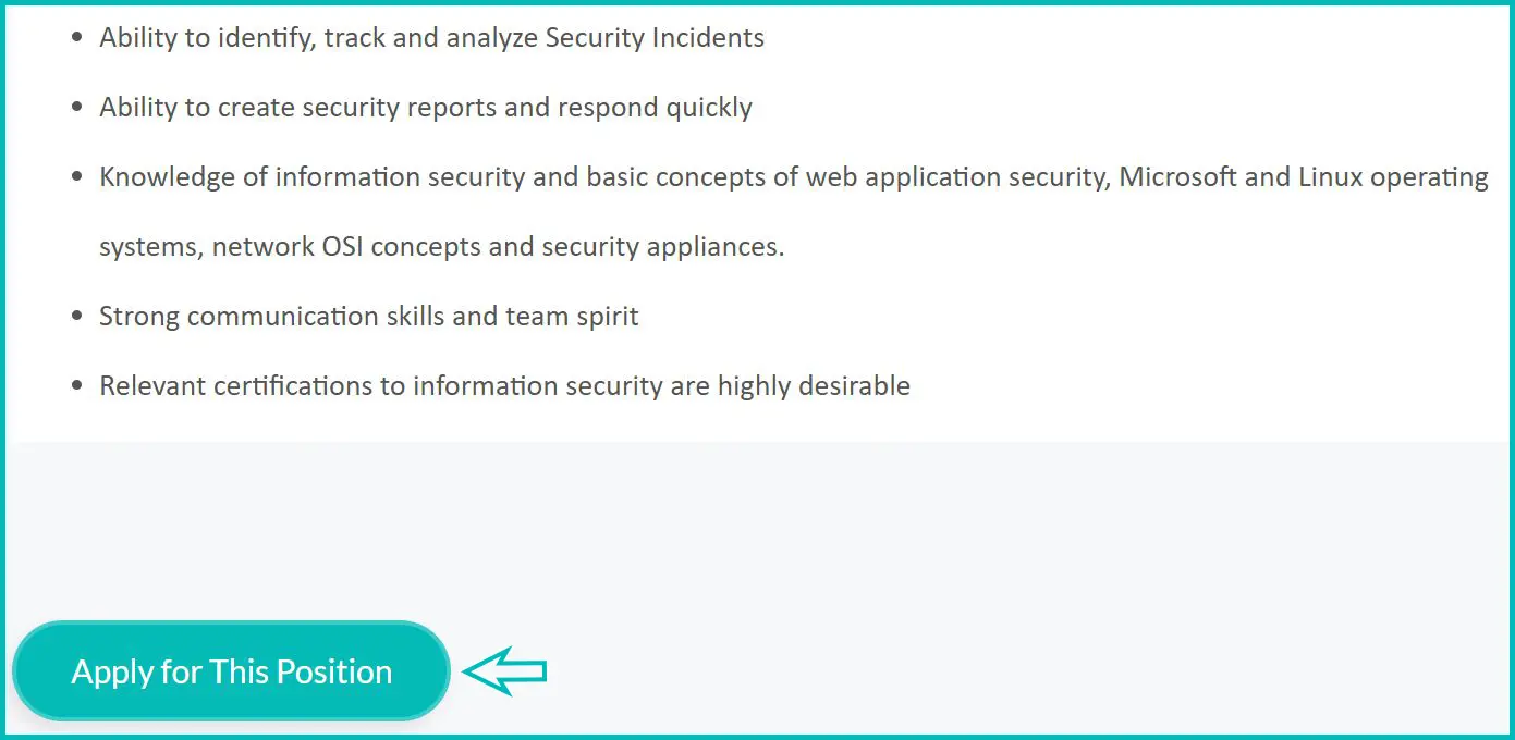 پس از ورود به صفحه مربوط به شغل انتخابشده، شرایط احراز و توضیحات درجشده را با دقت مطالعه کنید. در صورت تطابق شرایط با مهارتها و سوابق شما، بر روی دکمه «Apply For This Position» کلیک نمایید.