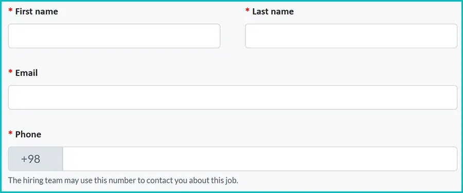 با کلیک بر روی گزینه «Apply For This Position»، وارد فرم استخدام میشوید. در این بخش لازم است اطلاعات هویتی خود شامل نام و نام خانوادگی، آدرس ایمیل و شماره تماس را بهصورت دقیق وارد نمایید.