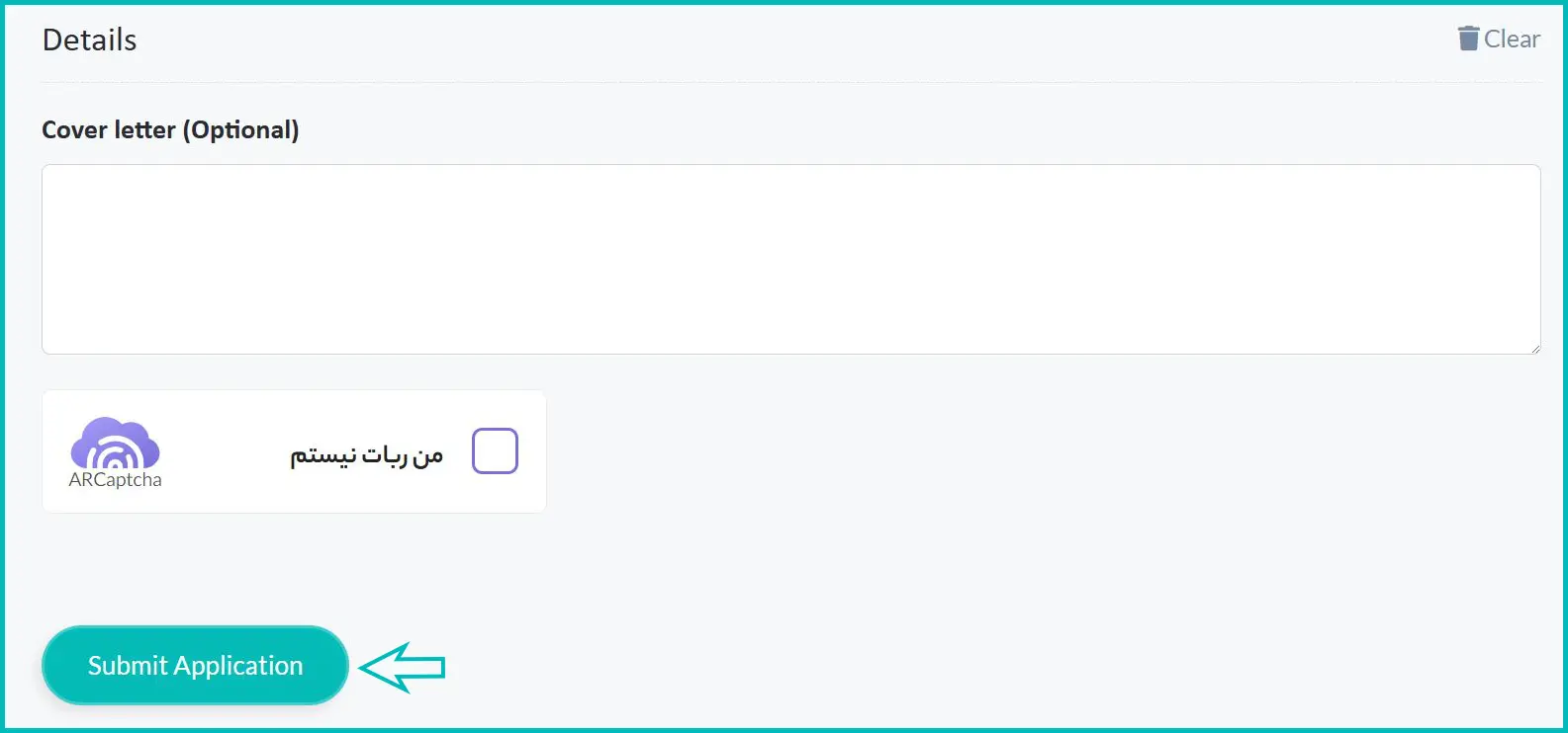 پس از تکمیل تمامی بخشهای فرم، در صورت نیاز توضیحات تکمیلی خود را در کادر مربوطه درج نمایید. سپس گزینه «من ربات نیستم» را فعال کرده و در نهایت بر روی دکمه «Submit Application» کلیک کنید تا درخواست شما ثبت شود.