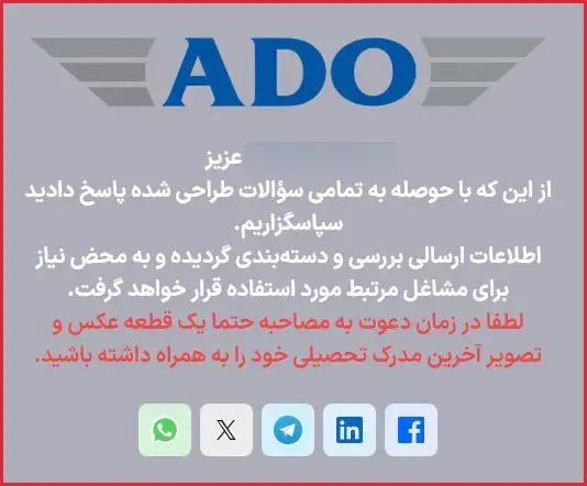 توجه: این فرم استخدام بر اساس نسخه دسکتاپ طراحی و تنظیم شده است؛ بنابراین ممکن است در تلفن همراه با تغییراتی در نمایش یا چیدمان مواجه شوید. بهمنظور سهولت در تکمیل فرم، توصیه میشود از رایانه استفاده نمایید.