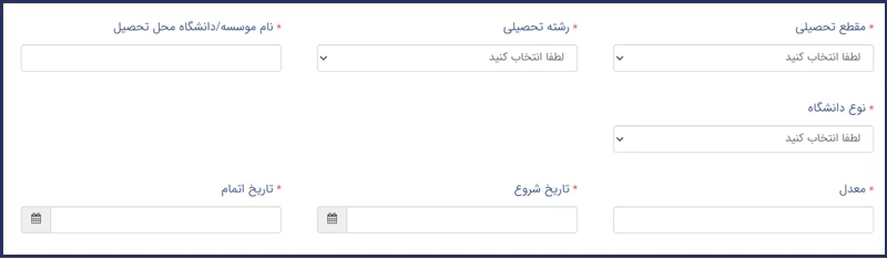 در این مرحله باید سوابق تحصیلی خود، شامل مقطع و رشته تحصیلی را از بین گزینههای موجود انتخاب کرده، سپس اطلاعاتی نظیر نام دانشگاه، نوع دانشگاه، معدل و.. را وارد نمایید.