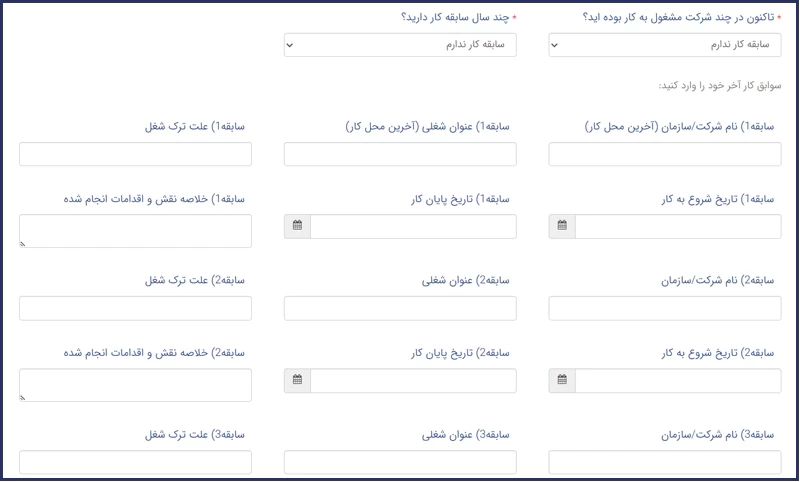 این مرحله مربوط به اطلاعات سوابق حرفهای شما است که در آن باید تعداد سالهای سابقه کار و تعداد شرکتهایی که تاکنون در آنها مشغول به کار بودهاید را مشخص کرده، سپس میتوانید سوابق کار خود شامل نام شرکت یا سازمان، عنوان شغلی، تاریخ شروع و پایان همکاری و.. را وارد نمایید.