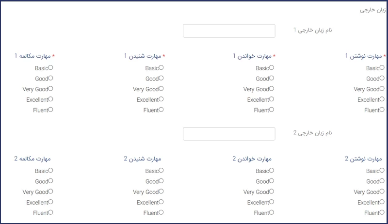در این مرحله باید اطلاعات مربوط به زبانهای خارجی خود، شامل نام زبان و میزان مهارت در بخش نوشتن، خواندن، شنیدن و مکالمه را وارد نمایید.