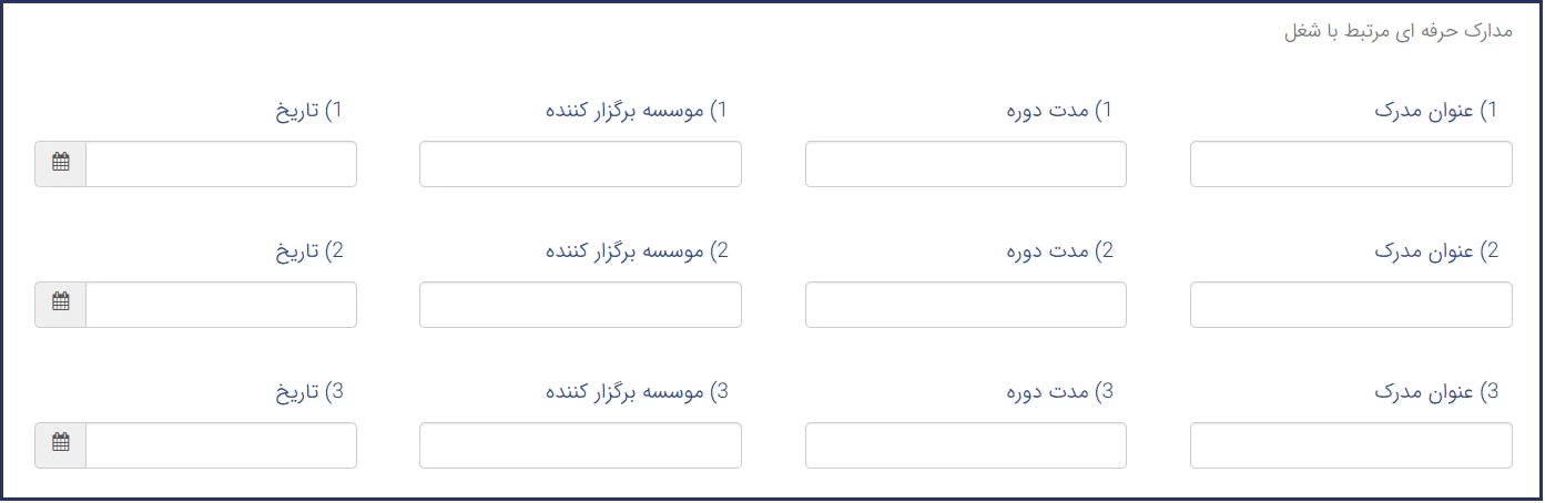 این مرحله مربوط به مدارک حرفهای مرتبط با شغل شما است که در آن میتوانید اطلاعاتی نظیر عنوان مدرک، مدت دوره، نام مؤسسه برگزارکننده و تاریخ دریافت را وارد نمایید.