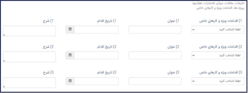در این مرحله باید اطلاعات مربوط به اقدامات ویژه و کارهای خاص خود را ثبت نمایید. برای هر مورد، میتوانید نوع اقدام را از فهرست موجود انتخاب کرده و سپس عنوان، تاریخ اقدام و شرحی مختصر از محتوای فعالیت را وارد نمایید.