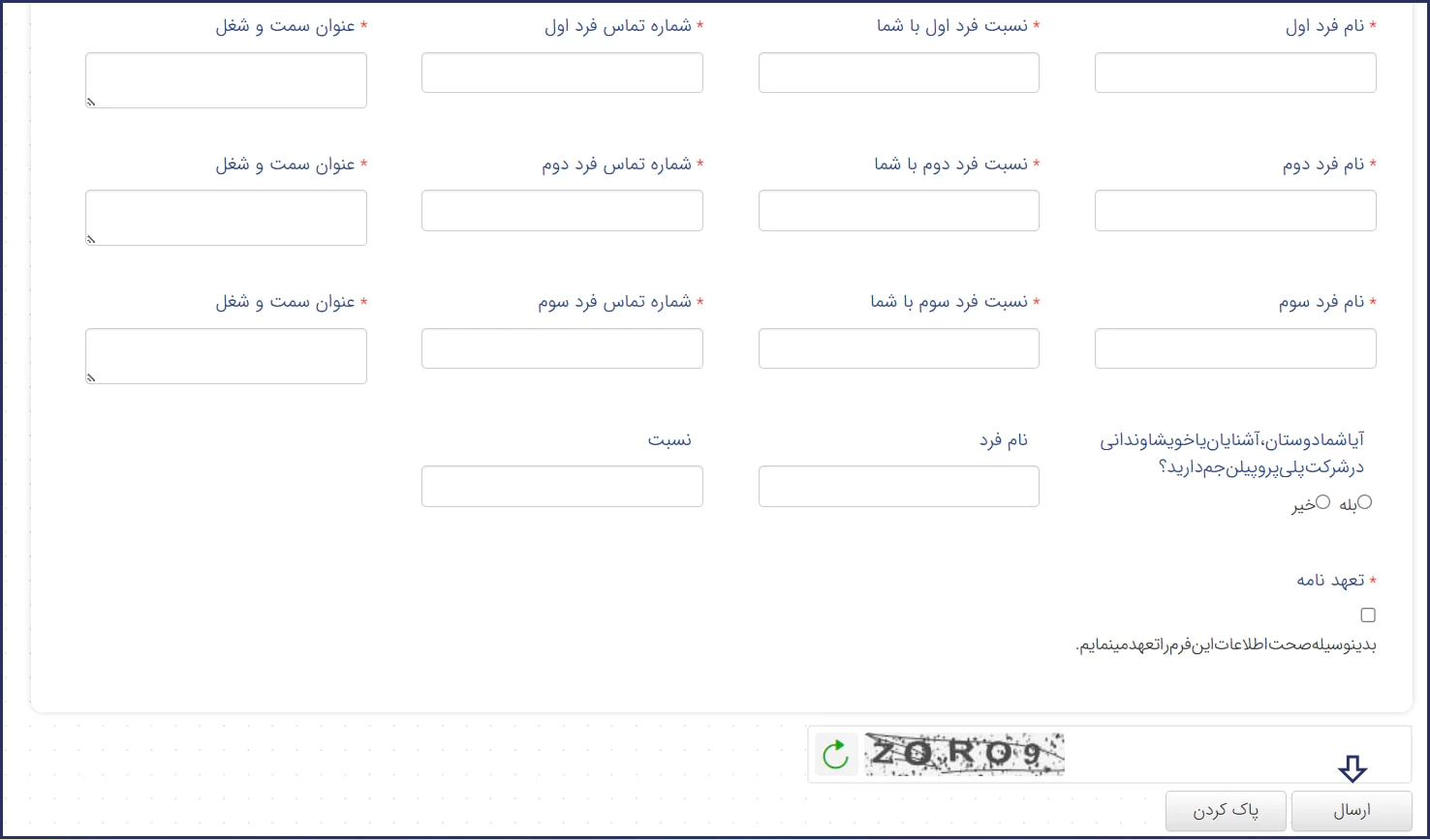 در این مرحله باید اطلاعات سه نفر از افرادی را که شما را از نظر شغلی میشناسند، وارد نمایید. برای هر فرد، لازم است نام، نسبت با شما، شماره تماس و عنوان سمت یا شغل فعلی را ثبت کنید. همچنین باید به این پرسش پاسخ دهید که آیا در شرکت پلیپروپیلن جم آشنایان یا خویشاوندانی دارید یا خیر. در پایان، تیک مربوط به تعهدنامه را فعال کرده، کد امنیتی را وارد نموده و سپس بر روی دکمه "ارسال" کلیک نمایید.