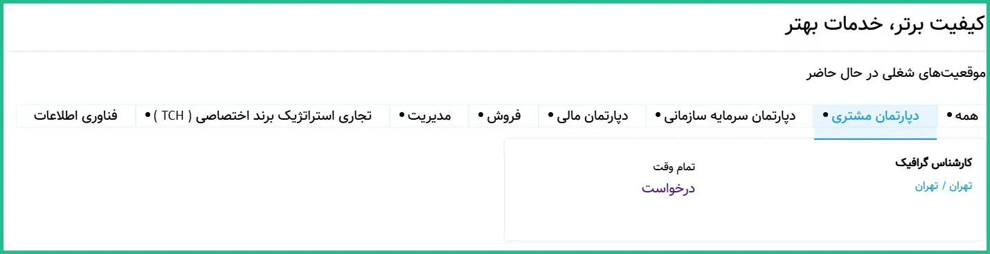 پس از ورود به صفحه فرصت های شغل، صفحه را به سمت پایین اسکرول کرده و از بخش میانی صفحه موقعیت های شغلی فعال را بررسی کنید و در صورت وجود عنوان شغلی مدنظر، بر روی گزینه «درخواست» کلیک نمایید.