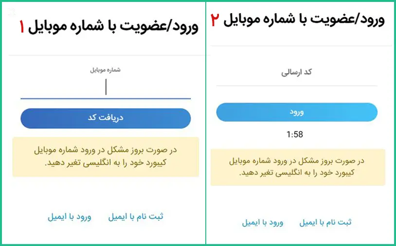 پس از کلیک بر روی گزینه درخواست، شماره تلفن همراه خود را وارد کنید. سپس کد ارسالشده از طریق پیامک را در کادر مربوطه وارد کرده و بر روی دکمه «ورود» کلیک نمایید.