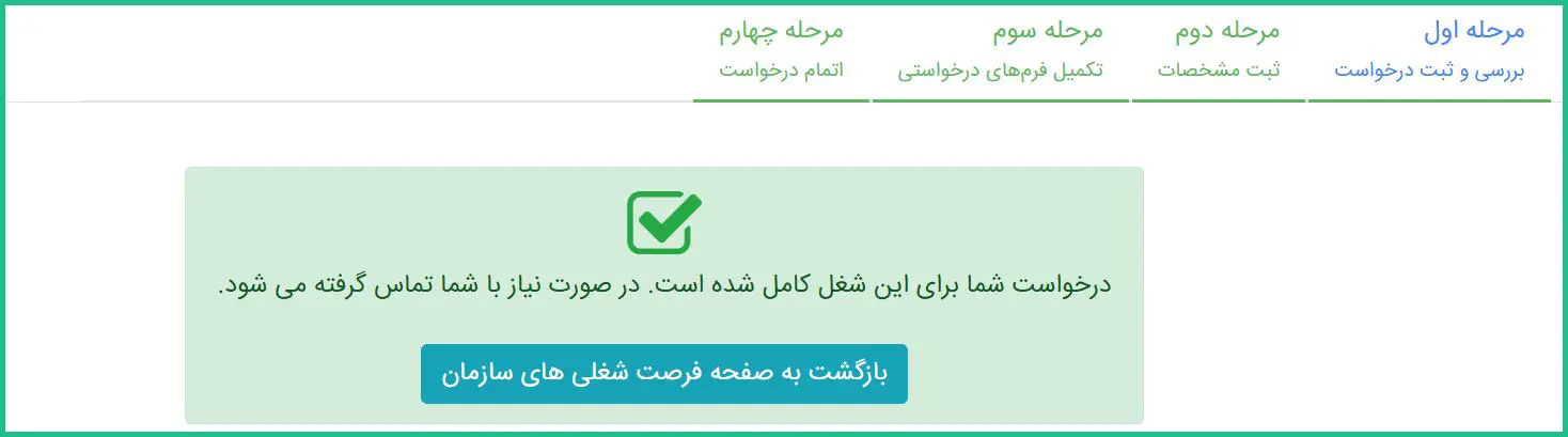 در این مرحله، شرایط و توضیحات مربوط به شغل انتخابی را مطالعه نمایید. در صورتی که مهارتها و سوابق شما با شرایط این موقعیت شغلی مطابقت داشت، بر روی دکمه «درخواست» کلیک کنید.