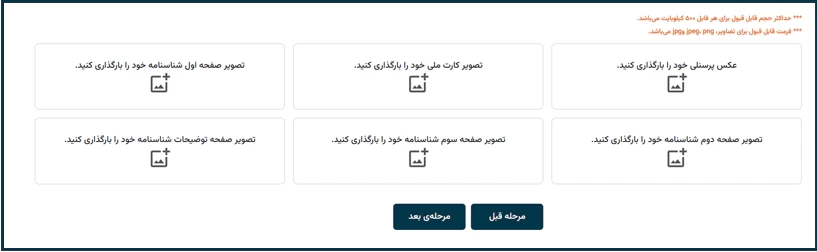 در این مرحله لازم است مدارک هویتی و عکس پرسنلی خود را در سامانه بارگذاری نمایید.