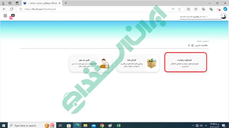 در گام دوم از منوی مکاتبات اداری امکان دسترسی به فرم های درخواست فراهم خواهد شد.