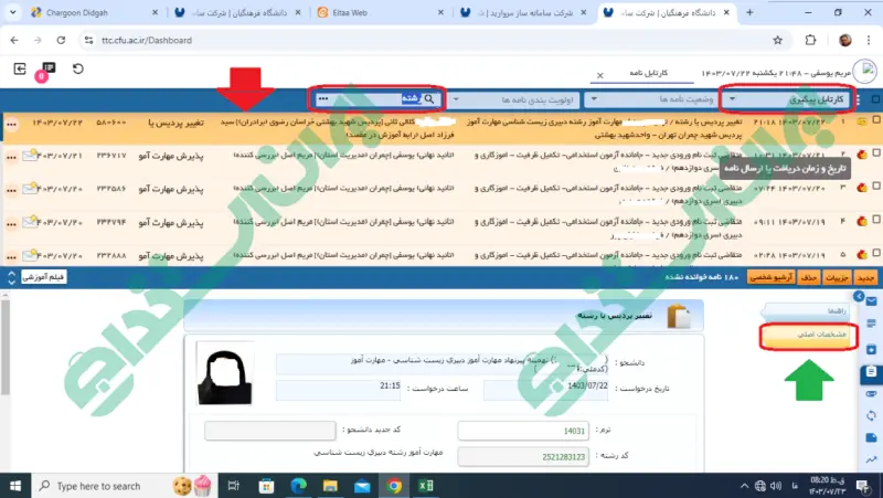 برای رویت درخواست دانشجویان دو روش وجود دارد که توصیه می شود انتقال دانشجویان از روش اول و کارتابل نامه ها انجام شود (تصویر شماره 1 و 2)