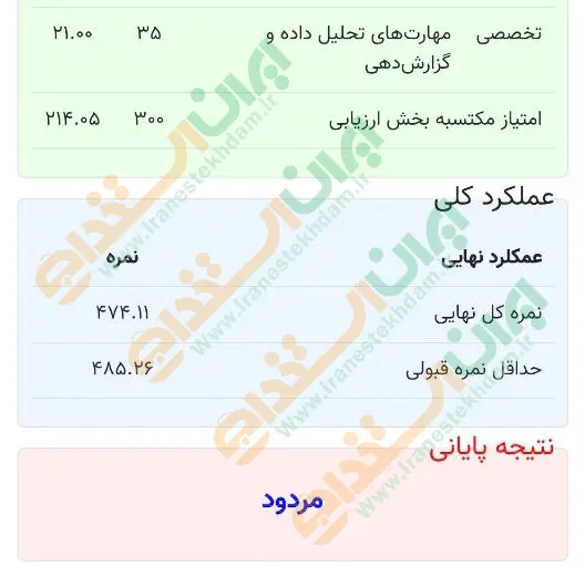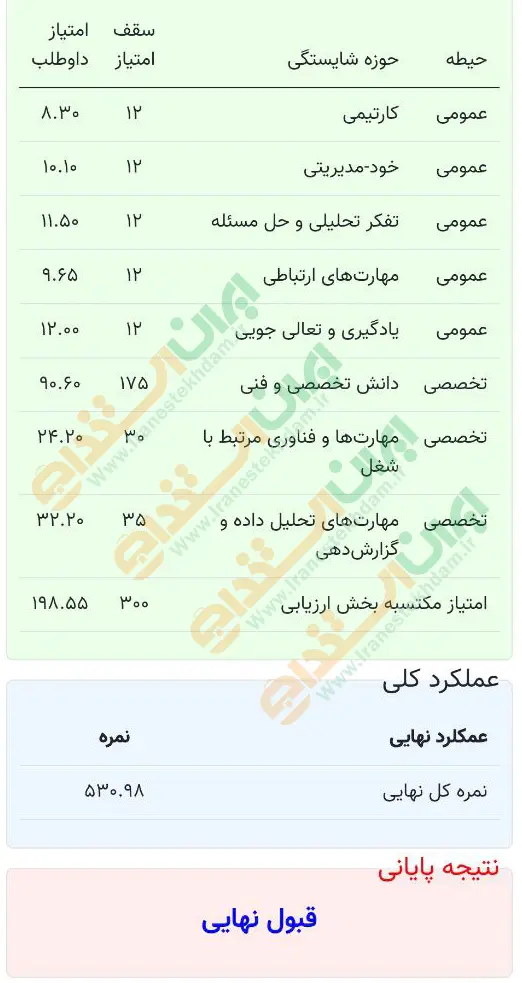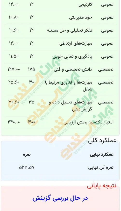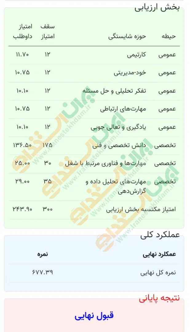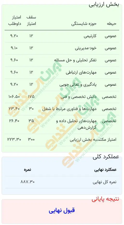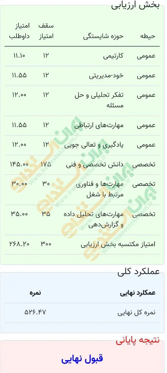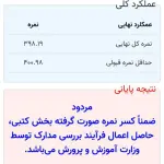 جهت مشاهده نمونه کارنامههای نهایی استخدام آموزش و پرورش در سال 1404 بر روی تصویر کارنامه کلیک نمایید.