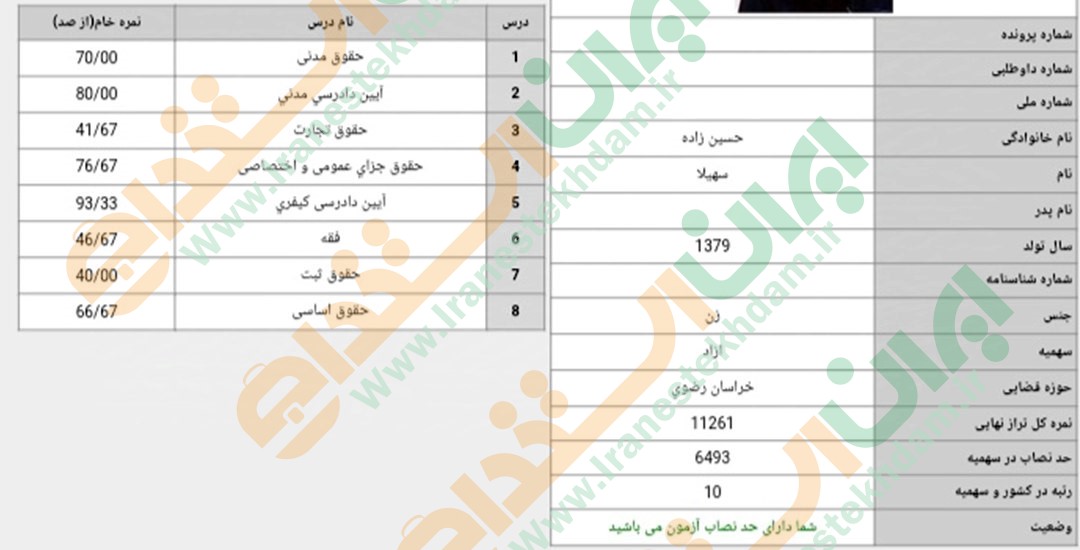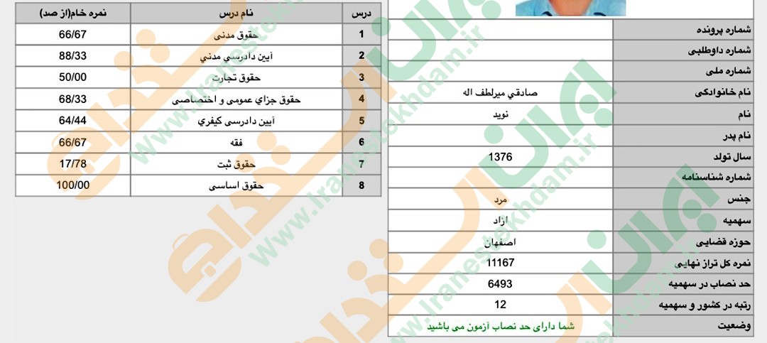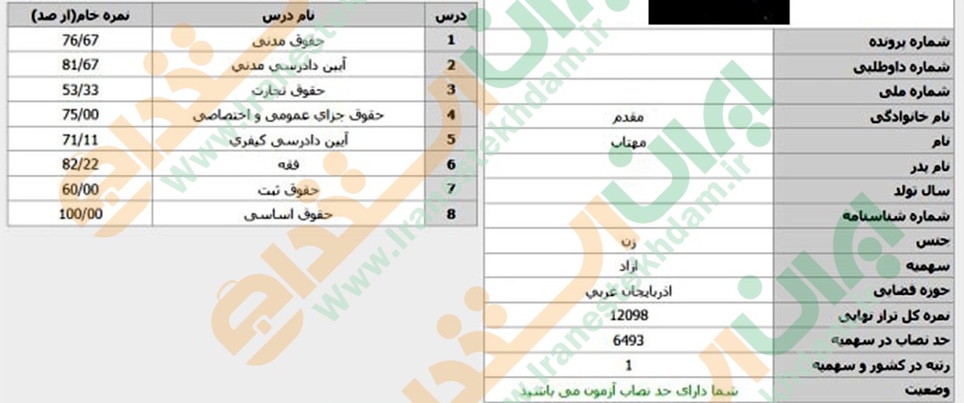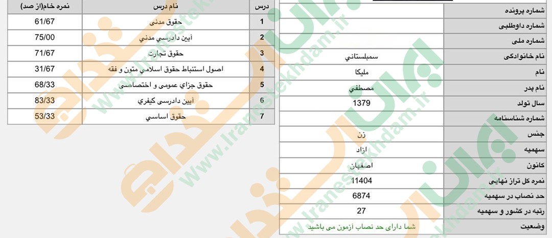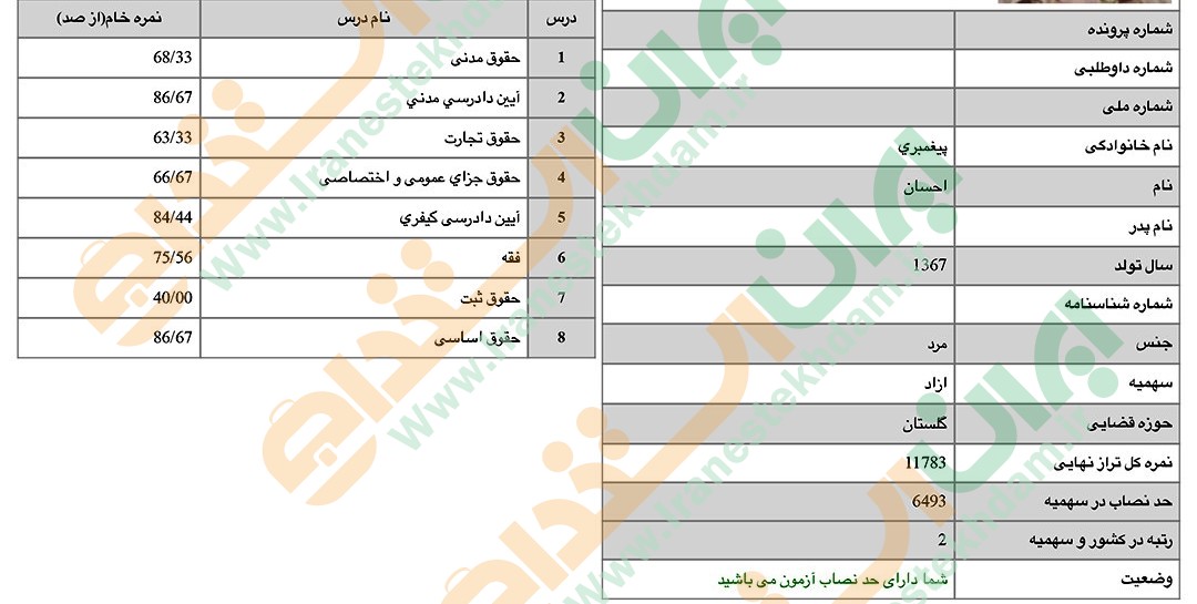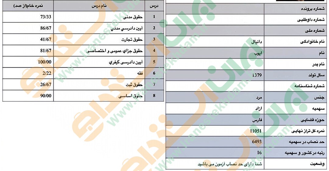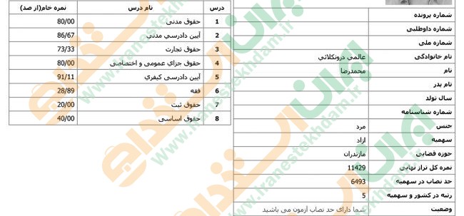 جهت مشاهده نمونه کارنامههای آزمون وکالت دادگستری بر روی تصویر کارنامه کلیک نمایید.