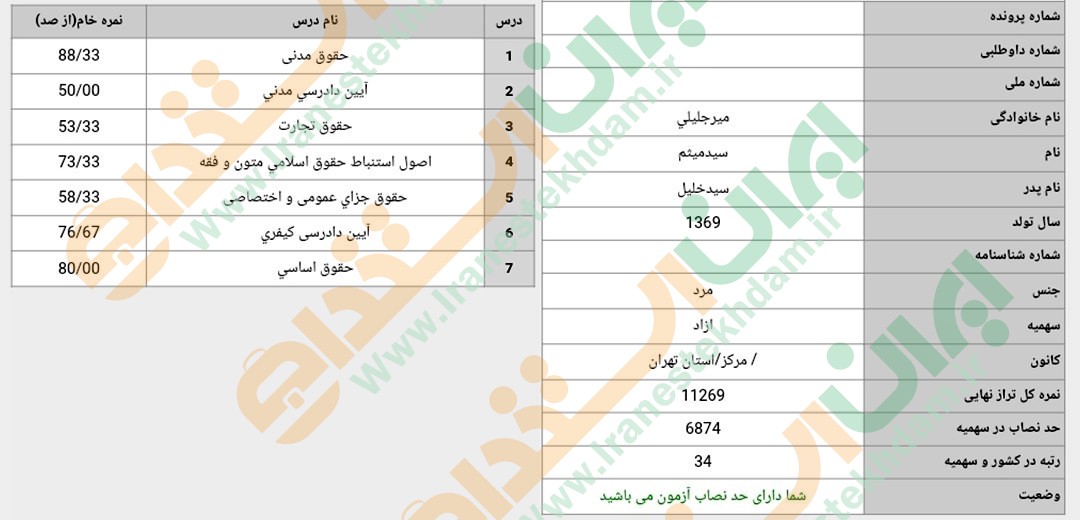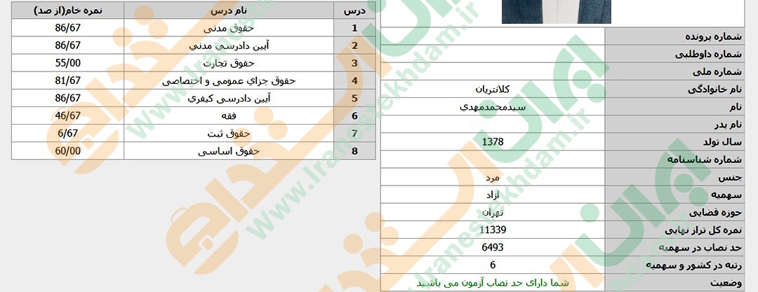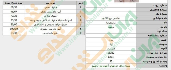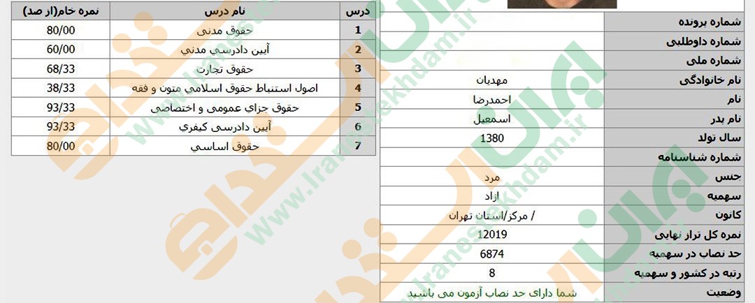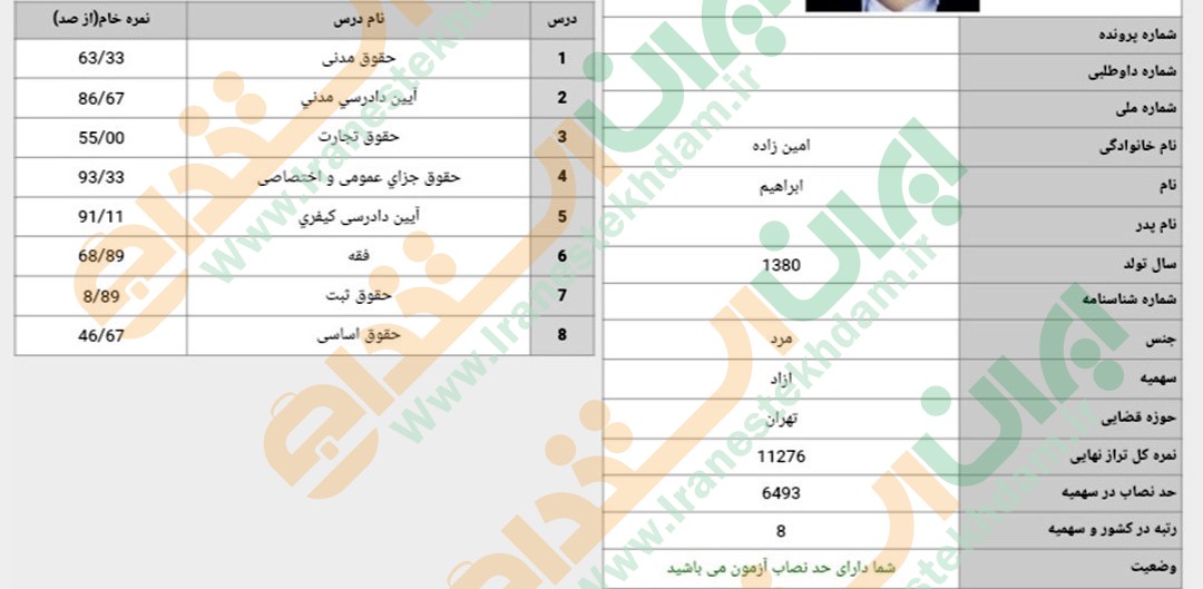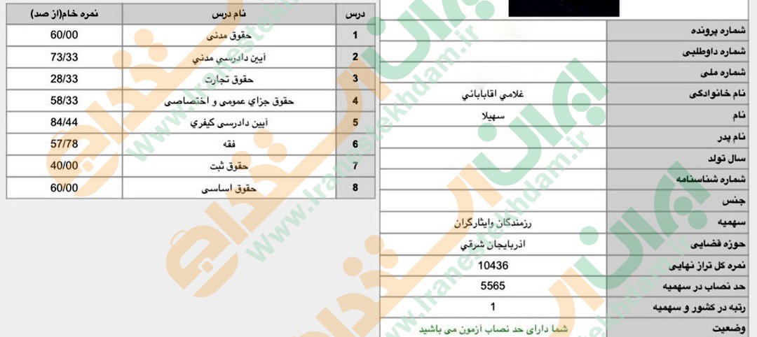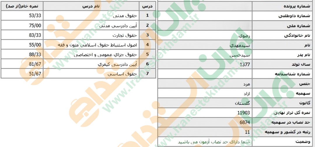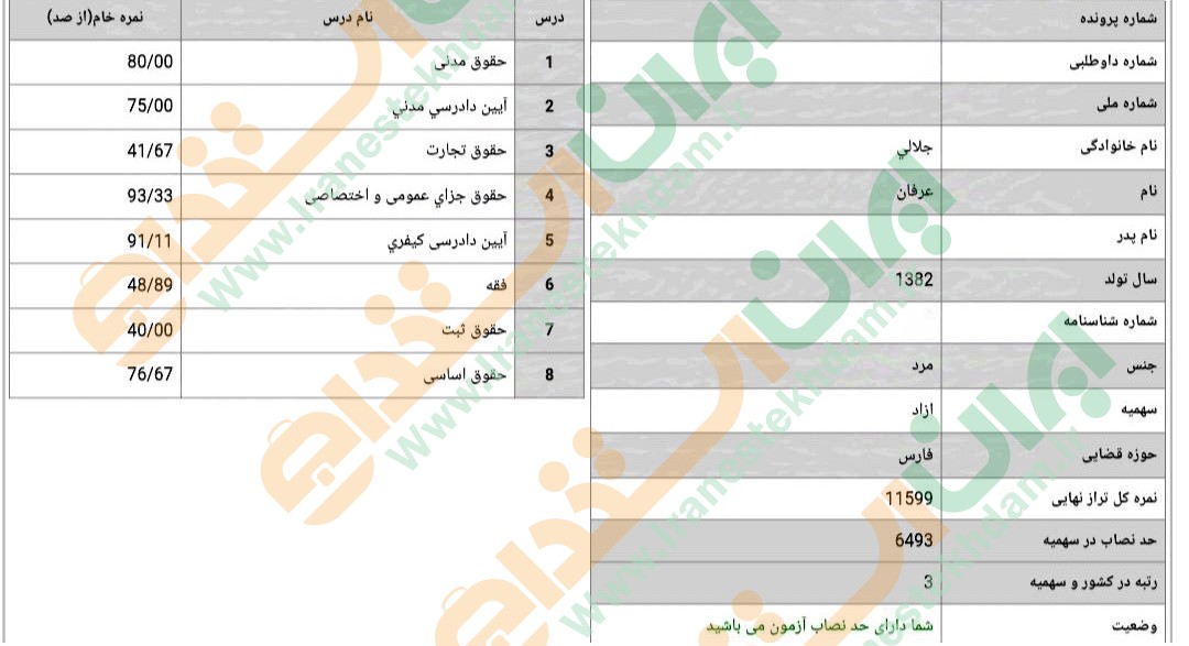 جهت مشاهده نمونه کارنامههای آزمون وکالت دادگستری بر روی تصویر کارنامه کلیک نمایید.