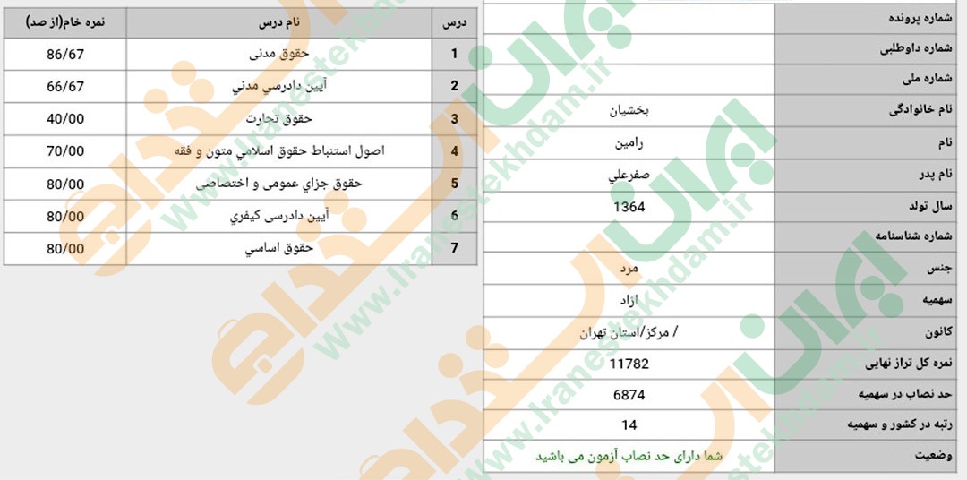 نمونه کارنامه های آزمون وکالت دادگستری سال ۱۴۰۳