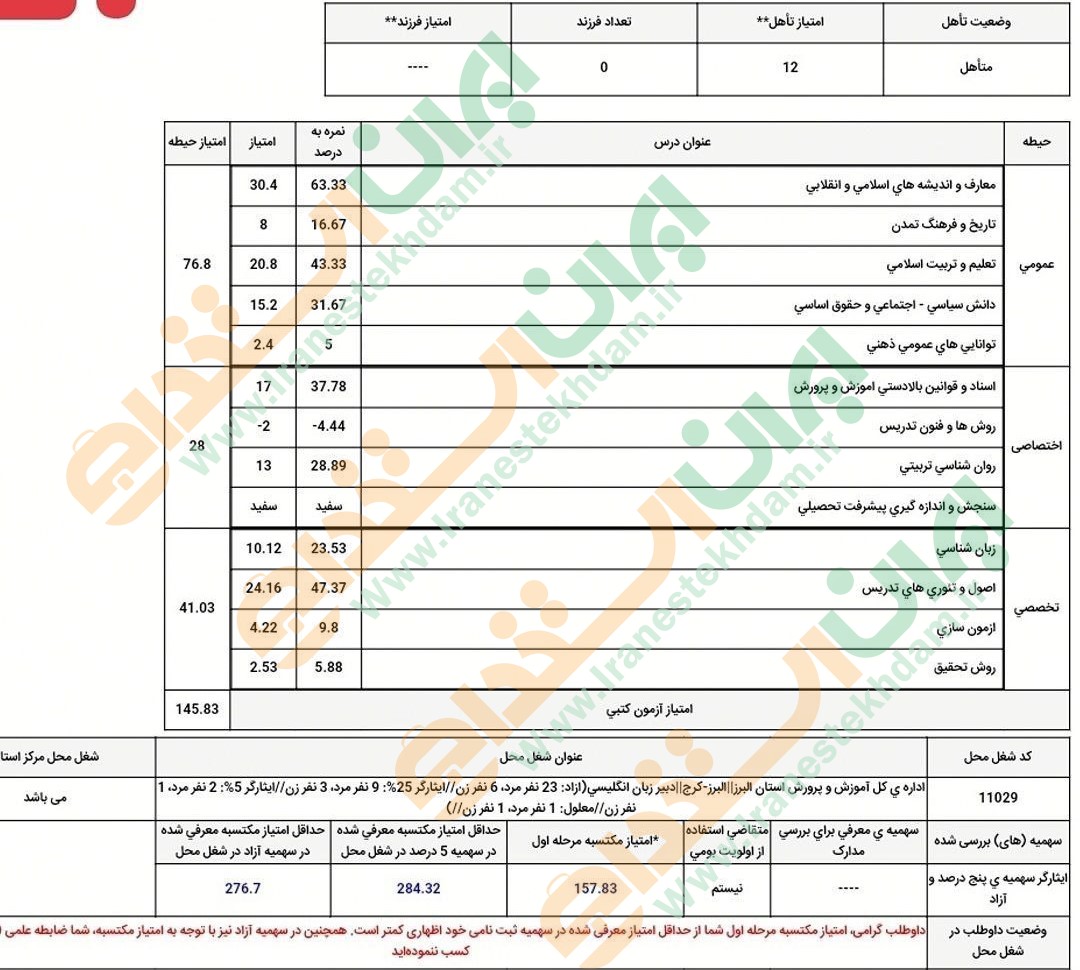 جهت مشاهده نمونه کارنامههای نهایی آزمون استخدامی دبیری و هنرآموز در سال 1403 بر روی تصویر کارنامه کلیک نمایید.