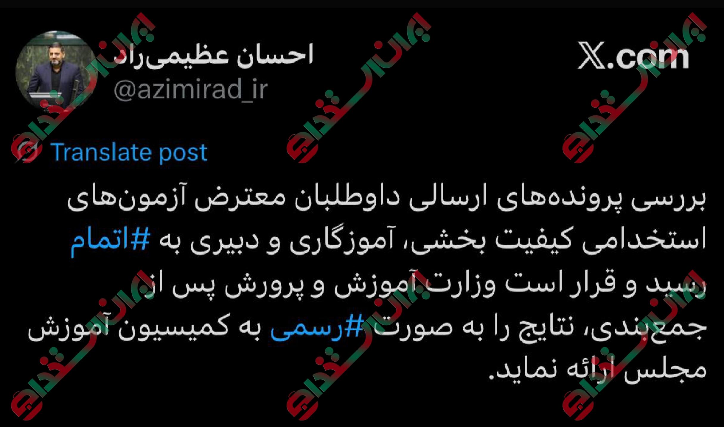 احسان عظیمی راد نماینده مردم مشهد، سخنگوی کمیسیون آموزش مجلس با انتشار توییتی در پیام رسان ایکس گفت: بررسی پروندههای ارسالی داوطلبان معترض آزمونهای استخدامی کیفیت بخشی، آموزگاری و دبیری به اتمام رسید.