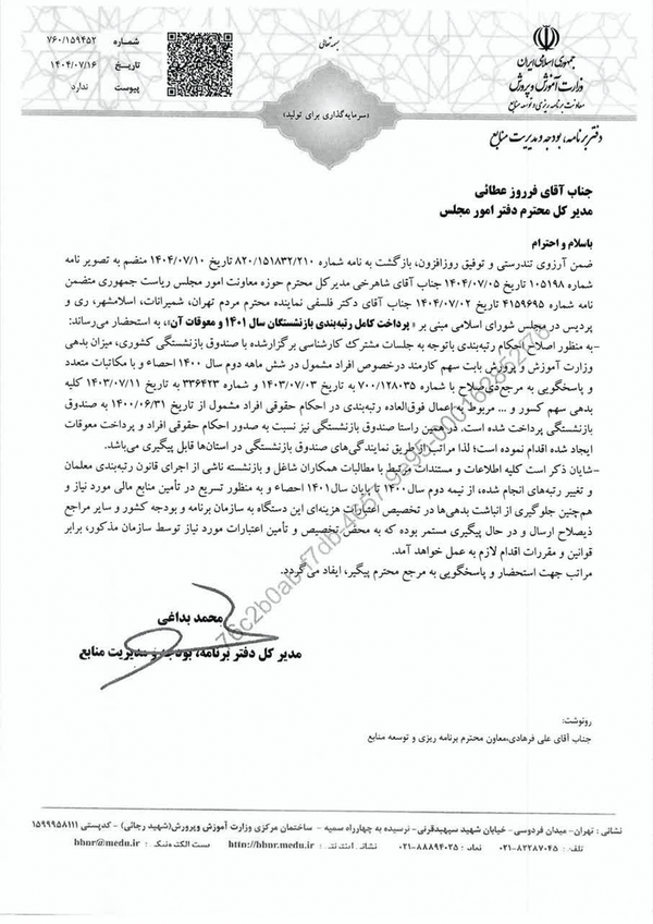نماینده تهران از تهیه و ارسال فهرست کامل مطالبات شاغلان و بازنشستگان به سازمان برنامه و بودجه خبر داد و گفت: تمام محاسبات انجام شده و اکنون معوقات رتبهبندی معلمان منوط به تخصیص بودجه شد.